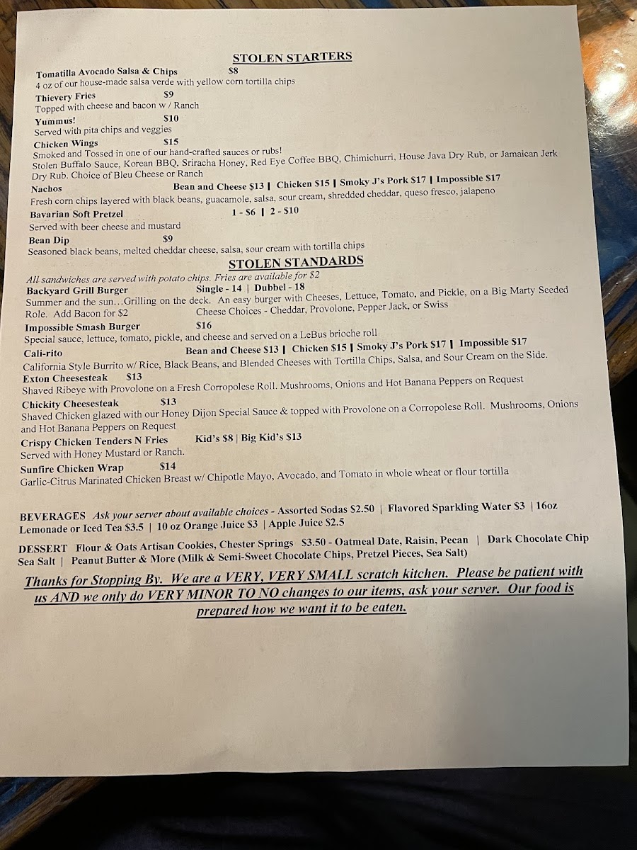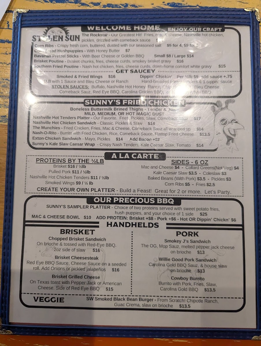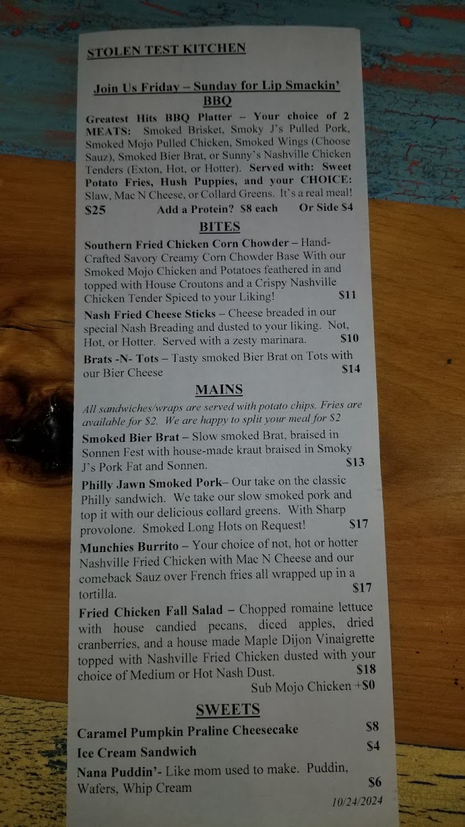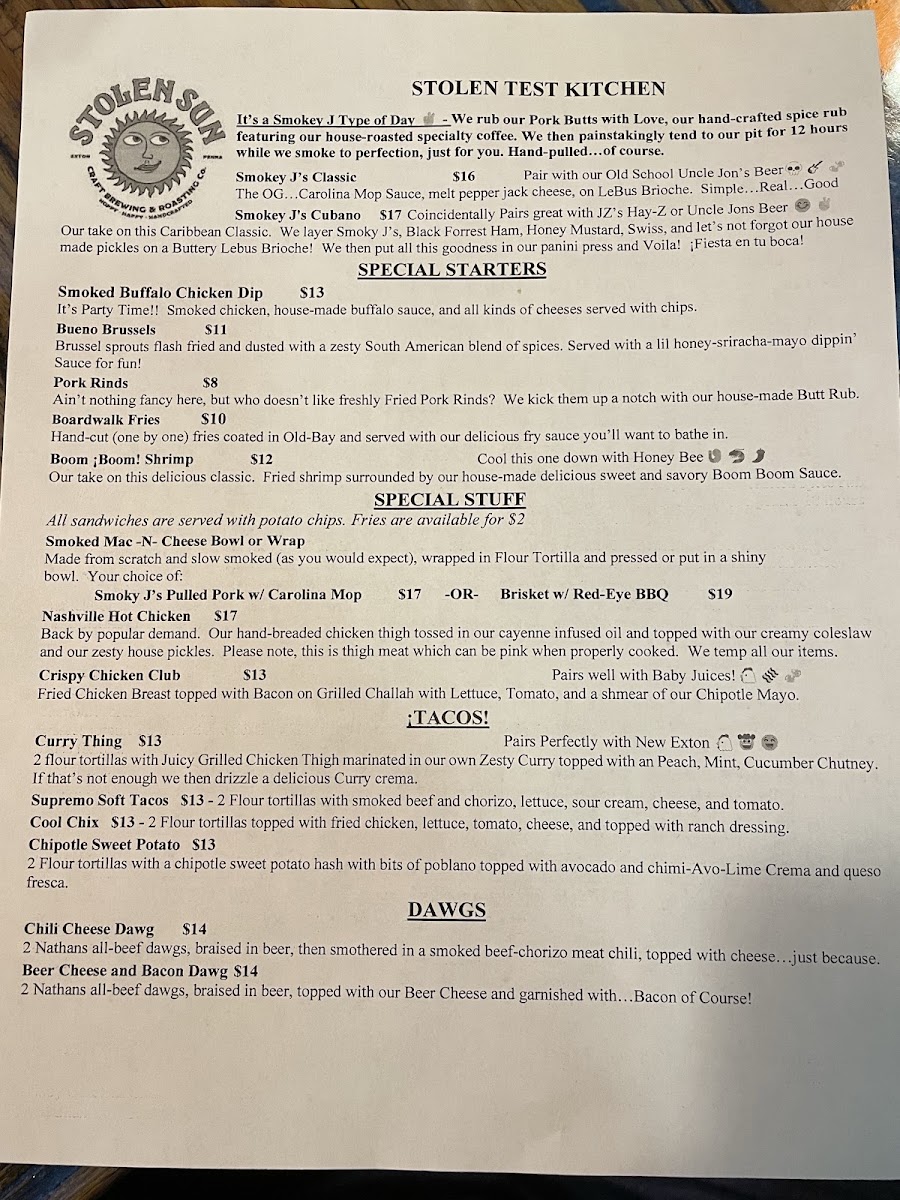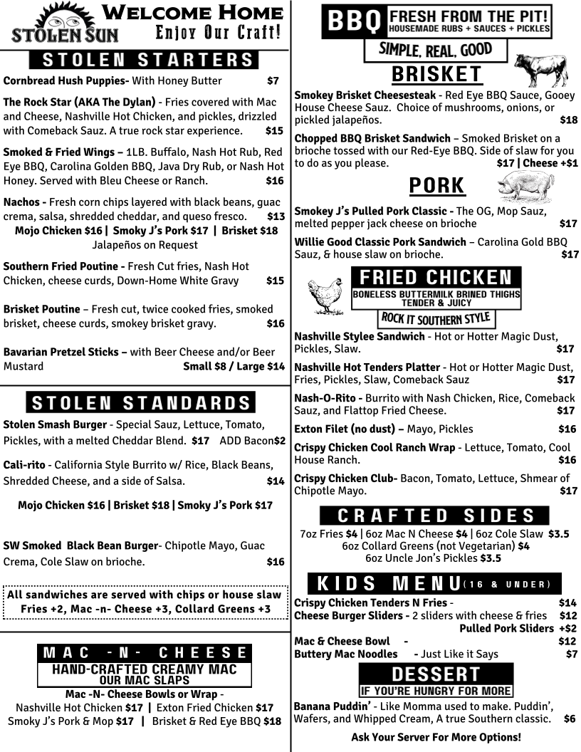 Red Eye BBQ Sauce, Gooey House Cheese Sauz. Choice of mushrooms, onions, or pickled jalapeƱos.